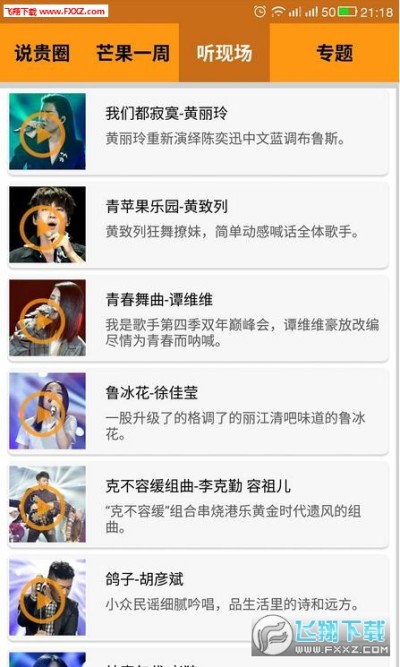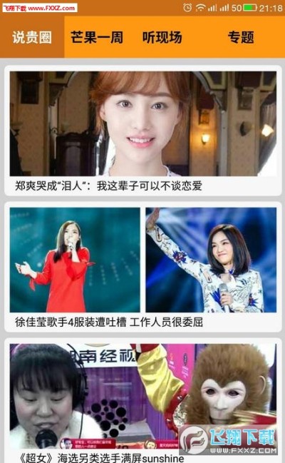 2、芒果星扒客app包含多个界面,如“说贵圈”、“芒果一周”、“听现场”、“专题”等栏目,为用户提供湖南卫视海量精彩视频、音乐进行点播观看,并针对市场热门IP,不定时推出与节目相关的趣味游戏,与用户进行互动。