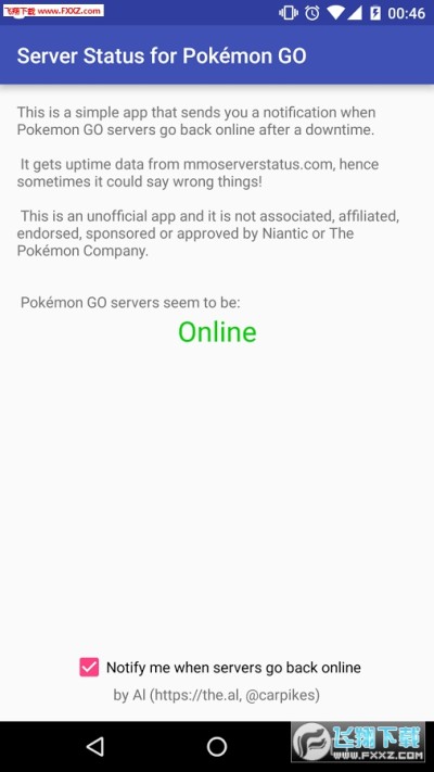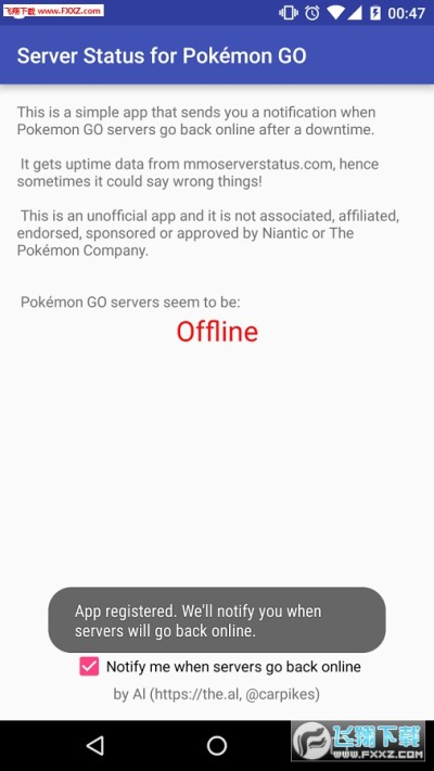 这个应用将会在Pokemon GO服务器崩溃后重新上线的情况下发送通知给你。