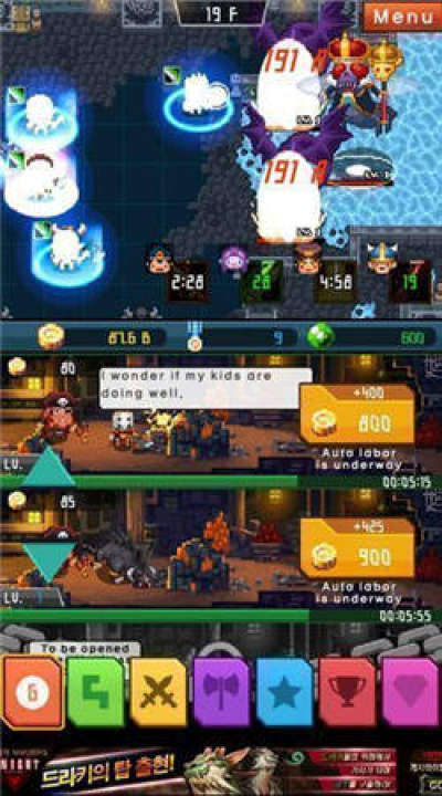 作为放置类,你基本上看着就好了,有钱就升升武器和技能,训练自己的英雄等级,让地下城探索速度更快......但是要小心奴役区那边,被抓的怪物是有可能逃跑的,别被他们跑了结果上了头条哦。另外,游戏一开始是英文,可以在设置里调成繁中。