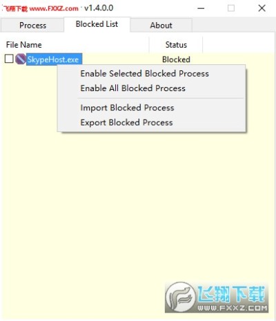 而在「Blocked List」标签页中我们可以看到已经被禁用了的进程,并且在对应进程上点击鼠标右键来对进程解除禁用。