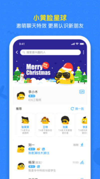 (3)“小黄脸星球”上线啦,用激萌的聊天特效,认识星球上的新朋友。搜索精准,一搜就找到你喜欢的人。