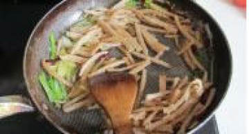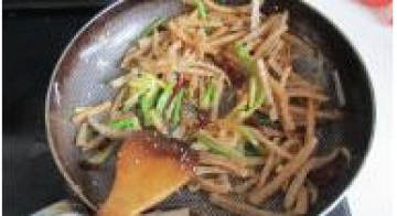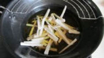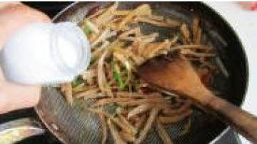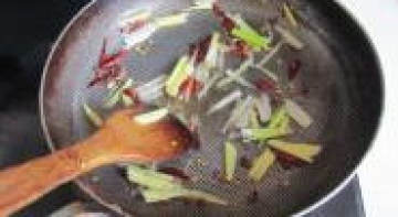 炒锅内留少许底油,调入盐、花椒、姜丝、葱段、辣椒丝煸香炒;