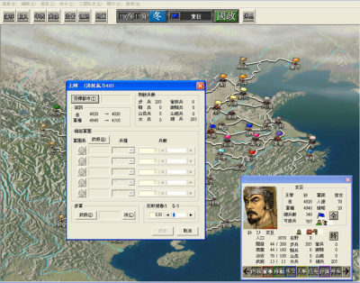 (二)把几支军队移到城门口附近,但是城墙上敌军射不到;然后把我军一个智将设定为「挑拨、待命」敌军智能低的;再把我军猛将、兵多的设定为「城门、占领政厅、猛进」;一「执行」后,就会发现根本不需攻城,攻城还会损兵,只要用此法,就可以趁敌军冲出来的时候,"顺便"冲进去,这个城门就等于被打开了。另外平时攻击指定方针后再按一下下方[方针]的按钮,部队就会自动去做事了,在我众敌寡时根本也是一直按[执行]键就成了。