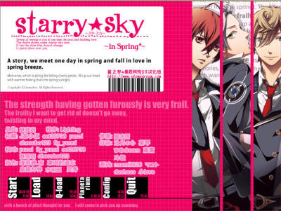 日本近来的看书游戏越来越多,大打美女牌,这部也不例外,画风有点像网球王子的漫画游戏。游戏的故事发生在“星月学园”,是坐落在墟落小高丘的整日制高校。拥有能大概明白观察星空的良好地理条件。星月学园分为6种专业,以教诲门生学习天文知识为目的。