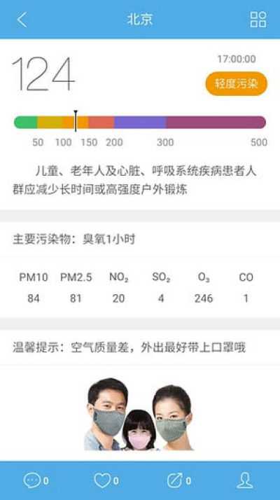 3.空气质量实时报告:包含PM2.5、PM10等六项污染物,关注空气质量,关爱你的健康;