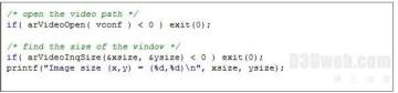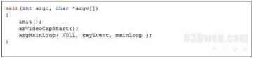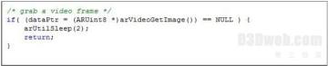 ARToolKit 应用程序的大部分调用都在这个例程里完成,这个例程包含了相对于《开发原则》中所要求的步骤二到步骤五。首先通过函数 arVideoGetImage 来捕捉一个输入视频帧:
