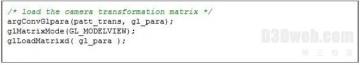 在这之后你需要这个把转移矩阵(3*4 的矩阵)转化成 OpenGL 适用的格式(16 个值的向量),可用函数 argConvGlpara 来完成此功能。这十六个值是真实世界的摄像机的位置和姿态信息,因此利用这些信息可以设置虚拟世界摄像机的位置,因此任何的图形物体都可以被准确地放置在相应的真实标识卡上。