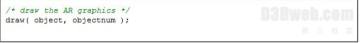 函数 draw 分为显示环境初试化,设置矩阵,显示物体几个部分。你可以使用 ARToolKit显示一个三维物体并设置最小的 OpenGL 状态来初始化一个 3D 显示: