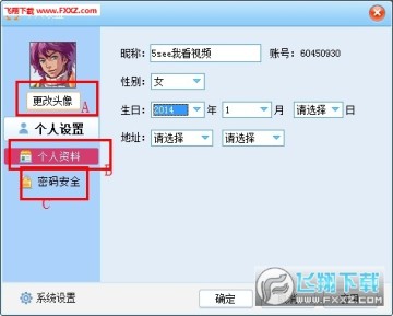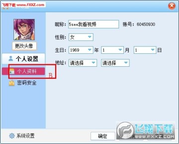 B 修改个人资料:点击[个人资料]按钮,设置您喜欢的昵称,选择性别、生日和地址,以及查看您收到的礼物,记得要点[确定]哦~