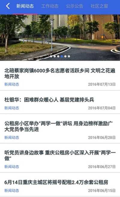 新闻公告:包含新闻动态、工作动态、公示公告、社区之窗等。