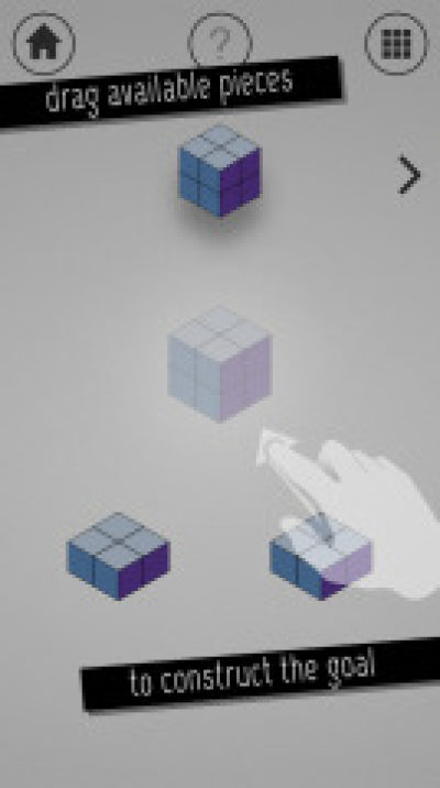 该作给人的感觉有点像3D风格的俄罗斯方块加拼图结合体,整体看来还算比较简单易懂:画面中会散落多个独立方块或者由它们所组成的立体图形,在最上方则是当前关卡目标,即玩家要拼成的物体。