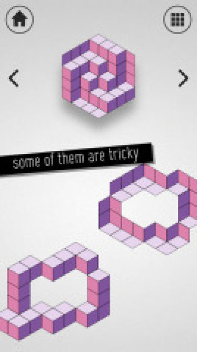 酷比克 kubic 是基于埃舍尔艺术的错觉休闲拼图游戏,拼出不可能的图形。如果你喜欢七巧板或者拼图类的游戏,那么强烈推荐这款这款酷比克 kubic,比普通拼图多加了一个维度从而营造出错觉效果,后期复杂的图形简直令人崩溃。