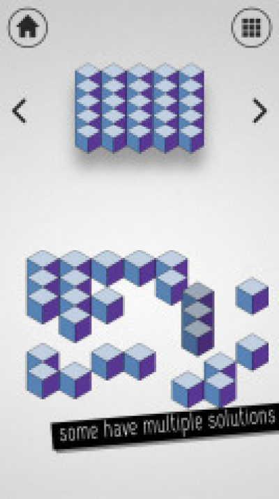 玩家要做的就是参考给出的目标,从那些散落的方块中选出需要的部分,并将它们排列组合拼成目标物体。游戏采取关卡模式,所以一开始难度并不会很高,但越往后越不容易通关,对玩家空间想象力和眼力的考验也是水涨船高,玩起来十分耐人寻味。