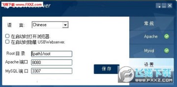 在设置里面,你可以 Apache 和 MySQL 的端口号,修改网站根目录 (默认位于 USBWebserver 里的 root 文件夹),以及启动时打开浏览器、启动后隐藏等。