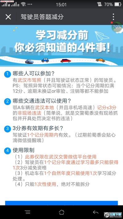 “驾驶员学习减分”活动系由武汉市公安局交管局联合腾讯·大楚网共同推出,只要是武汉市在籍的机动车驾驶员,进入“武汉交警”微信,完成“学习减分”环节,即可获得交通违法记分减免3分的机会,届时,武汉市籍机动车在处理武汉市罚款200元以内、3分以下的非现场违法时,可直接抵扣3分。
