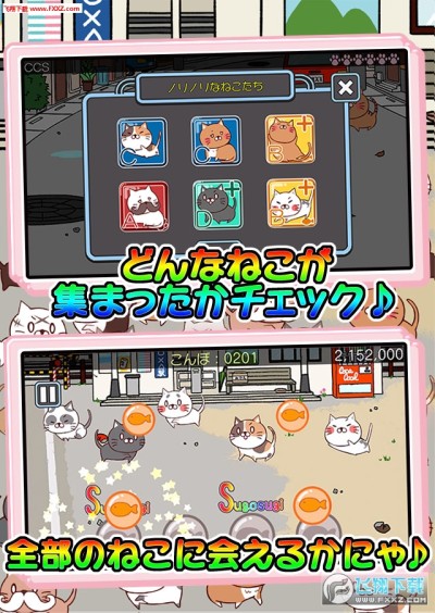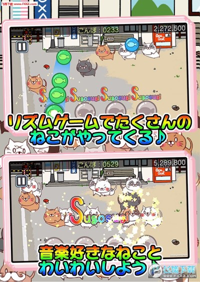 根据乐曲的节奏,在准确的时机点击按钮,就能收集到猫咪。点击的时间越准,评价就越高,能够收集到的猫咪就越多!