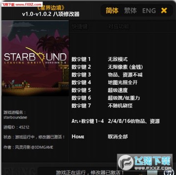 星界边境正式版v1.0-v1.0.2八项修改器3DM绿色版是针对同名pc游戏而开发的一款免费辅助,内置简体、繁体和英文三种语言,拥有无敌模式、无限像素、地图光照全开、超级速度、多倍物品、资源等功能,可以让玩家获得更好的游戏体验!