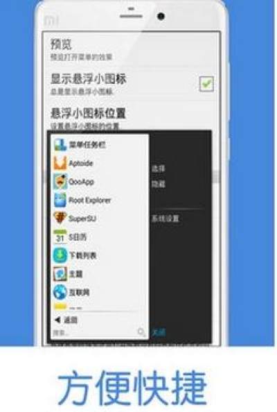 安卓菜单任务栏app是一款模仿电脑开始菜单任务栏的应用软件,通过此软件用户可以自由切换主题,还可以改变开关颜色,喜欢个性化设置的小伙伴可以来试试。