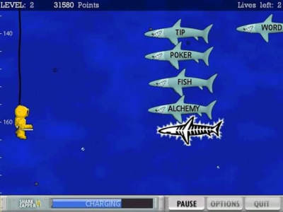 现在不都提倡寓教于乐吗?海底寻宝就是一款这样的游戏。不同于以前的海底冒险游戏。这款海底寻宝实际上是一款打字游戏。你的潜水员要通过打出游戏中的单词来消灭鲨鱼,不然就会被吃掉的哦。这样寓教于乐的游戏,你不下一个给你儿子/女儿玩吗?
