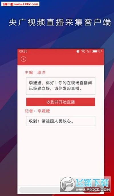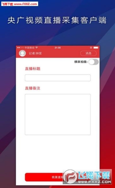 央广视频采集app其功能主要为视频直播,与后台编辑联系后建立视频,在央广新闻客户端中提供视频互动所用。此客户端需要不可注册,为官方指派用户所用。