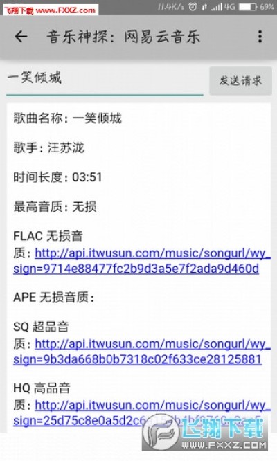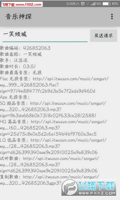 全局搜索:打开应用直接搜索歌曲名称,会弹出很多歌曲的详细信息,其中就有下载链接,复制链接下载即可。