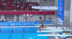 正当人们还没反应过来,另一个同伴帕霍尤也上场了……他决定赌上自己的尊严,来挽救菲律宾的面子。他走上跳水台,站在跳水台的最尾端,可以看出他真的很紧张,接着走往台前轻轻一跃……