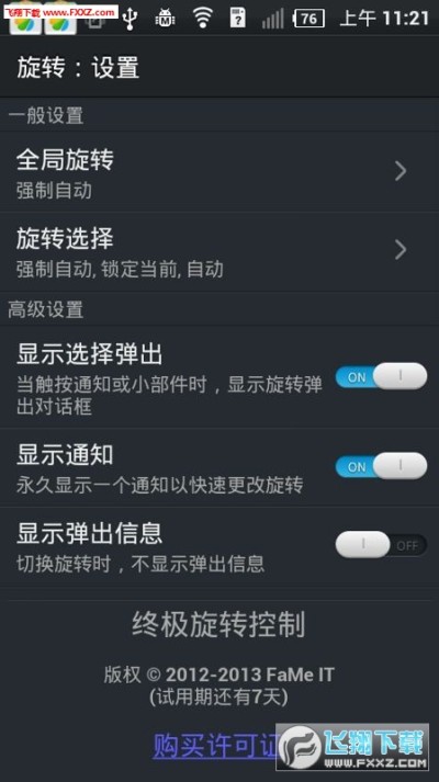 无限转屏Ultimate Rotation Control是一款屏幕旋转加强应用。支持锁定、强制转屏、反向转屏、手动旋转等模式,可以为每个应用设置不同的转屏模式。应用能创建快捷方式和小部件,或者从状态栏快速启动。