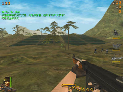 1944年抗日战争进入到了最要害的阶段,在抗日大抨击中,你作为我国远征军的成员之一,在一望无际的热带丛林中搜索前进。因为情报有误,你不慎深入日寇的重围。不过你并不孑立,你拥有大量良好的武器:M1911式自动手枪、Thompson冲锋枪、迫击炮、巴祖卡、航空凝集汽油弹。已经武装到牙齿的你,将遭遇日寇越来越猖獗的进攻,尽情地发扬你的火力,清除仇人。等你的胜利信息,士兵!