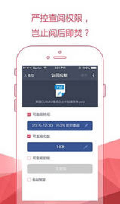 易控安全分享app是一款高安全性的创新型数字内容安全分享平台品;易控安全分享安卓版支持防复制、打印、转发...支持阅后即焚;支持全端同步操作,可在线审计追踪,并随时随地控制文件查阅权限;易控安全分享app能有效保护商业合同、课件、设计稿、提案、视频等智慧资产的传播安全。