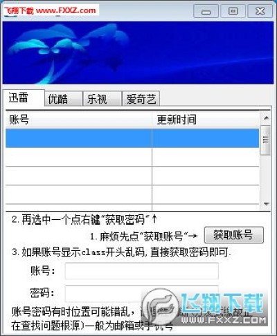首先选择迅雷/优酷/乐视/爱奇艺,然后点击获取账号,待账号获取完成之后,在表格选中需要获取密码的账号,右键单击,点击获取密码,软件自动进行解密,解密过程中软件有可能会变卡,10秒钟左右,账号和密码即可获取成功如果获取失败,请重新获取。