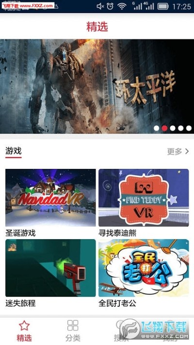 一款全面丰富的VR内容分发应用,为用户提供前沿的VR体验.其中分为精选 ,分类,搜索,以及个人中心模块,可以快捷的获取VR内容.