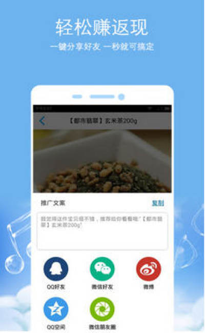 蜜饯是一款专门用来分享的APP。每个人都是一位媒体、一家微店,通过蜜饯将商品和活动分享给好友,好友购买成功后就能获取返现。