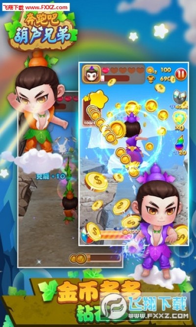 《奔跑吧葫芦兄弟OL无限金币破解版》是一款由官方正版授权,动作冒险类的3D竖版跑酷游戏。力大无穷的红娃,慧眼千里的橙娃,铜头铁臂的黄娃,刚阳烈焰的绿娃,气吞山河的青娃,来去无踪的蓝娃,本领无穷的紫娃。7只神奇的葫芦,7个本领超群的兄弟,在游戏中玩家将和他们一起与妖精们周旋,为救亲人前赴后继。原汁原味的葫芦娃角色,百分百还原动画场景,经典妖精再度出击,紧张刺激的3D跑酷,带你玩出新花样!