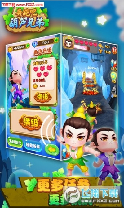 《奔跑吧葫芦兄弟OL无限金币破解版》游戏在奔跑的过程中,玩家会遇到不同的危险,蝎子精成为了拦路小兵,向你奔跑而来,蝙蝠也应声而起,阻挡在你前进的道路上。游戏中你将点击屏幕让葫芦娃各个角度进行闯关,挑战性极强,游戏为你原汁原味的还原了动漫中的经典卡通形象,与萌萌哒的葫芦娃展开一场全新的跑酷之旅!