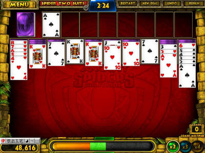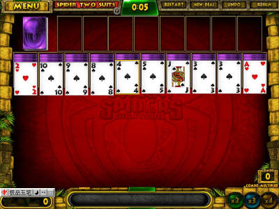 蜘蛛纸牌游戏的目的因此最少的移动次数将十叠牌中全部最前面的牌都移走。如要将十叠牌中全部最前面的牌都移走,请将牌从一列移到另一列,直到将一牌套从 K 到 A 依次排齐。当一组牌从 K 到 A 依次排齐时,这些牌就会被移走。 游戏的目标是以最少的移动次数将牌面中的十叠牌以及待发的五组,共计八副牌整理移除。当所有牌被移除整理到界面的左下方,游戏获胜。