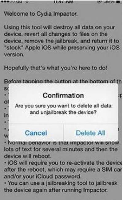 4.阅读说明后点击“delete all data and unjailbreak device”(删除所有数据并恢复设备到未越狱状态),然后点击“删除所有”确认。