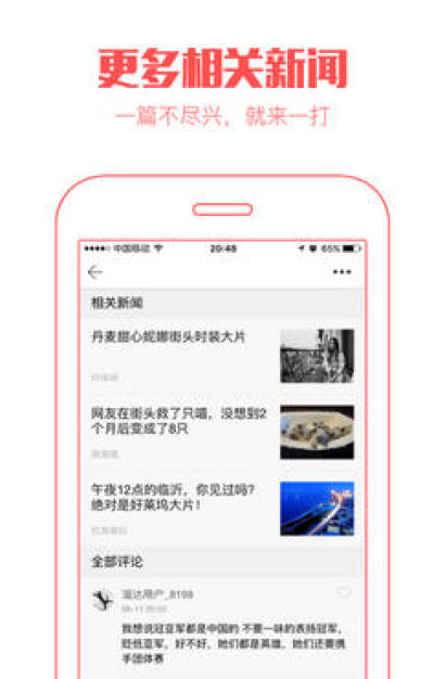 阅色具有非常贴心功能就是“相关新闻”,不论在文章下还是图集里都会有。读完一篇不过瘾,那就看相关新闻,看完一打又一打。阅读就是要尽兴!