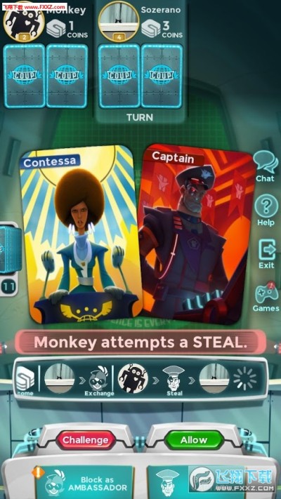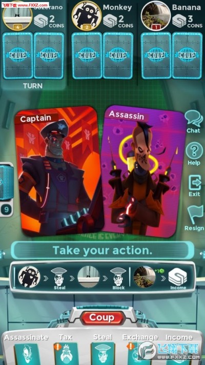 Coup是一款桌游题材的卡牌类手机游戏,游戏中玩家需要使用各种角色来一场尔虞我诈的游戏来获得更多的钱,同时让对方失去所有的角色,喜欢这款游戏的玩家快来下载试试吧!