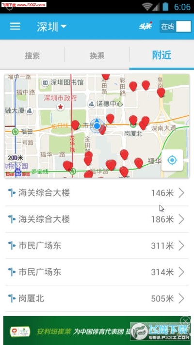 使用8684公交工具箱中的“附近站点”功能,可利用GPS自动查找附近站点,并显示在地图上。用户也可用此功能跳转到站点信息查询界面,查看附近站点公交线路信息。