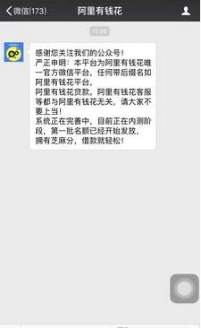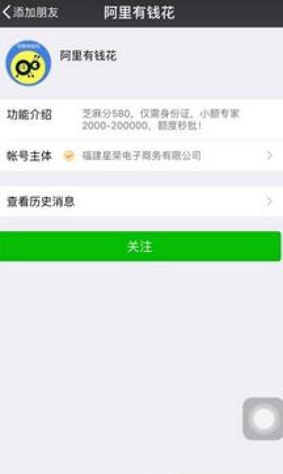 首先你需要使用微信关注阿里有钱花官方公众账号,直接搜索阿里有钱花,点击关注即可