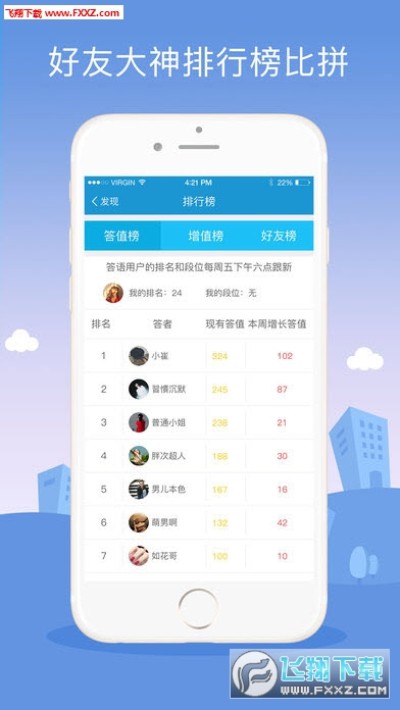 排行榜:这里有所有用户的答值榜、增值榜和你的好友榜,在这里进行比拼吧,在千万人之中展现自己。