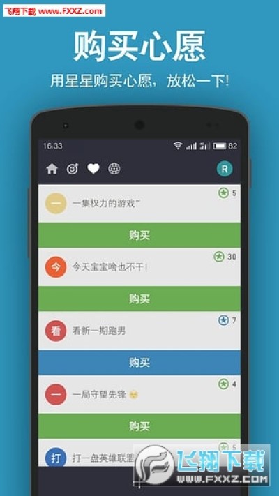 【心愿】: 想打一把英雄联盟(LOL)? 想吃些美食? 或者想来一场说走说走的旅行?看一场电影?你可以把你的心愿都添加进来,明码标价,用实现目标赚来的星星购买自己的心愿。
