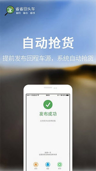 省省回头车是物流人必备的免费帮你找车找货找专线的物流助手,轻松发布找车、找货、专线信息,管理我的熟车、熟客、车源、货源信息,海量车源货源信息,快速实现车货匹配、物流调度。大卡车司机提前发布空车、回程车源信息,系统自动抢货,收到消息提醒,再联系货主洽谈,谈成走订单流程,安全有保障。天天有货拉趟趟货运满满,送货路上再也不怕被查,提前十公里就能收到查超载提醒!货主提前发布货源信息,找回头车送货巨便宜,专车的速度,远低于零担的价格。凭验证码收货、安全、零货损、回单有保障。