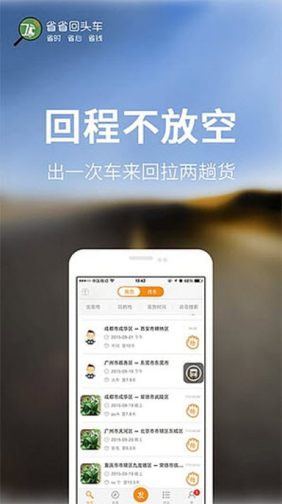 省省回头车软件是一款为货主、车主、物流公司提供找车、配货、物流调度、物流专线等货物运输信息服务。省省回头车主要致力于提高物流时效,降低货主的物流成本,增加车主收入。