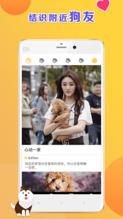 在“汪汪萌主”,我们希望为爱狗人士搭建一个快速、高效的交友平台。我们每天都会为用户推荐附近的狗友,只要双方彼此有好感并点击喜欢对方就能成功匹配并进行更深入的沟通交流,甚至相约遛狗。