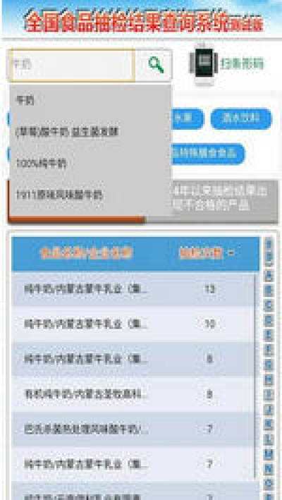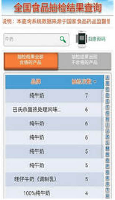 【便民】食安查提供直观、简洁、便于查询的界面,消费者可以通过三种方式进行查询:一是通过输入食品名称,快速找到其查询的食品抽检结果;二是通过选择食品分类,查询到食品的抽检结果;三是通过扫描商品条形码查询(此功能在完善中)。查询结果按照“抽检结果全部合格的产品”和“抽检结果出现不合格的产品”两类品牌清单进行排序,并分别按抽检次数和不合格率从高到低排序。