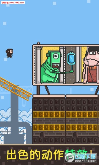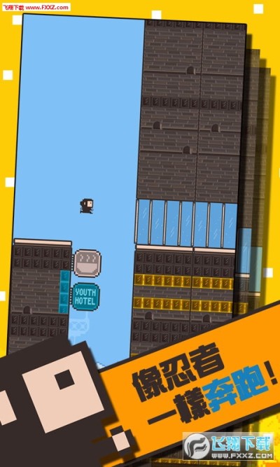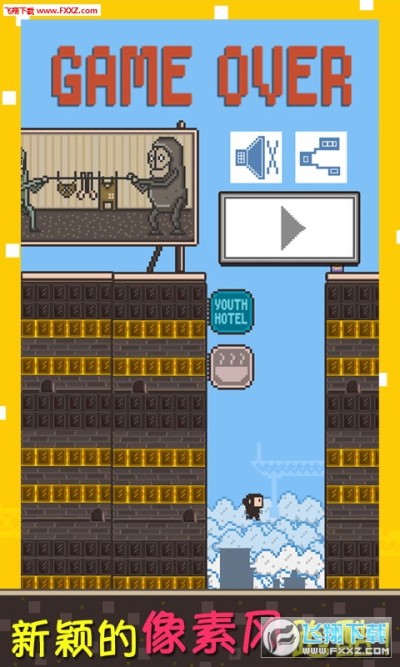 游戏中像素人会自动向前跑动,玩家只需要在适当的时候点击设备屏幕让主角起跳就好。游戏中主角在楼层中飞跃的动作舒展流畅,让人赏心悦目。而楼层之间的距离和障碍物的摆设位置也相当巧妙,很考验玩家对起跳时机掌握的熟练程度。