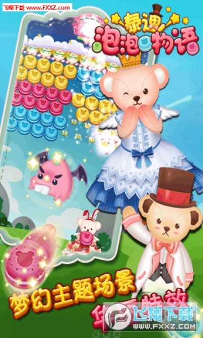 《泰迪泡泡物语官方最新正版手游》游戏中你将体验到奇幻世界里不同的风土人情,呆萌的泰迪、可人的安琪儿、风趣的饭饭猪,他们将陪伴你共同开启一段换装的奇幻之旅! 手指轻轻一滑即可操作,玩法简单易上手!随时随地消除无聊慵懒时光! 好玩到爆炸!根本停不下来好吗?游戏有着5大关卡类型、40余种障碍设计、600多个精心设计的关卡。你能一一的解锁并且通过它们吗?