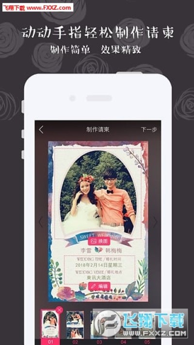 炫酷动画搭配动人音乐演绎你爱情的甜蜜,柬讯为您呈现细腻丰富的转场动画,让您的婚纱照飘然而动,跃然手机的另一端.