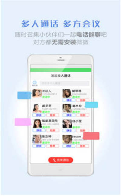 微微让您随时召集最多达100人的电话会议(会议人员无需安装微微),一次通话完成多人沟通。